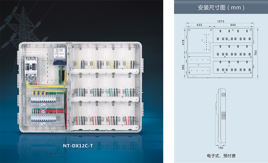 電表箱生產(chǎn)廠家-浙江南騰電氣有限公司研發(fā)的NT系列透明塑料電表箱,采用進(jìn)口聚碳酸酯(PC)和阻燃ABS工程塑料制成。具有抗沖擊、抗老化、耐腐蝕、透明度高、抗紫外線、安裝方便等優(yōu)點,并且具有用電安全保護(hù),用戶分離控制,數(shù)據(jù)采集, 防盜電等功能。產(chǎn)品適合安裝電子式、機(jī)械式、智能IC卡預(yù)付式、智能多費率式電表。南騰NT系列透明塑料電表箱自推出市場以來,憑借其完美的設(shè)計理念,在電表箱行業(yè)遙遙領(lǐng)先。